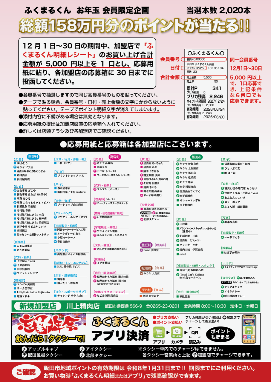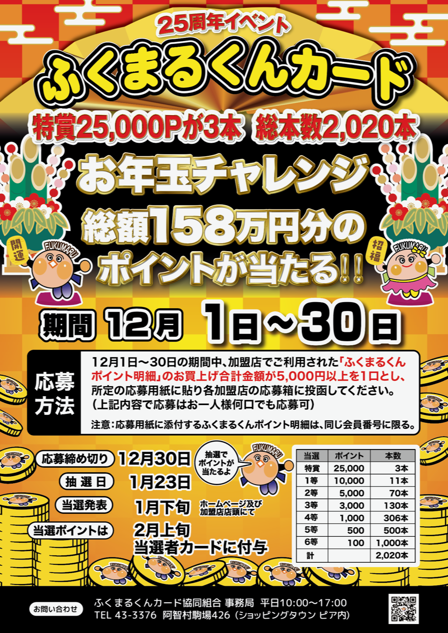 ★ お年玉企画 開催! ★ ポイントがたまる、使える、特典いっぱいのふくまるくんカード。阿智・高森・飯田などの各加盟店で使えます。